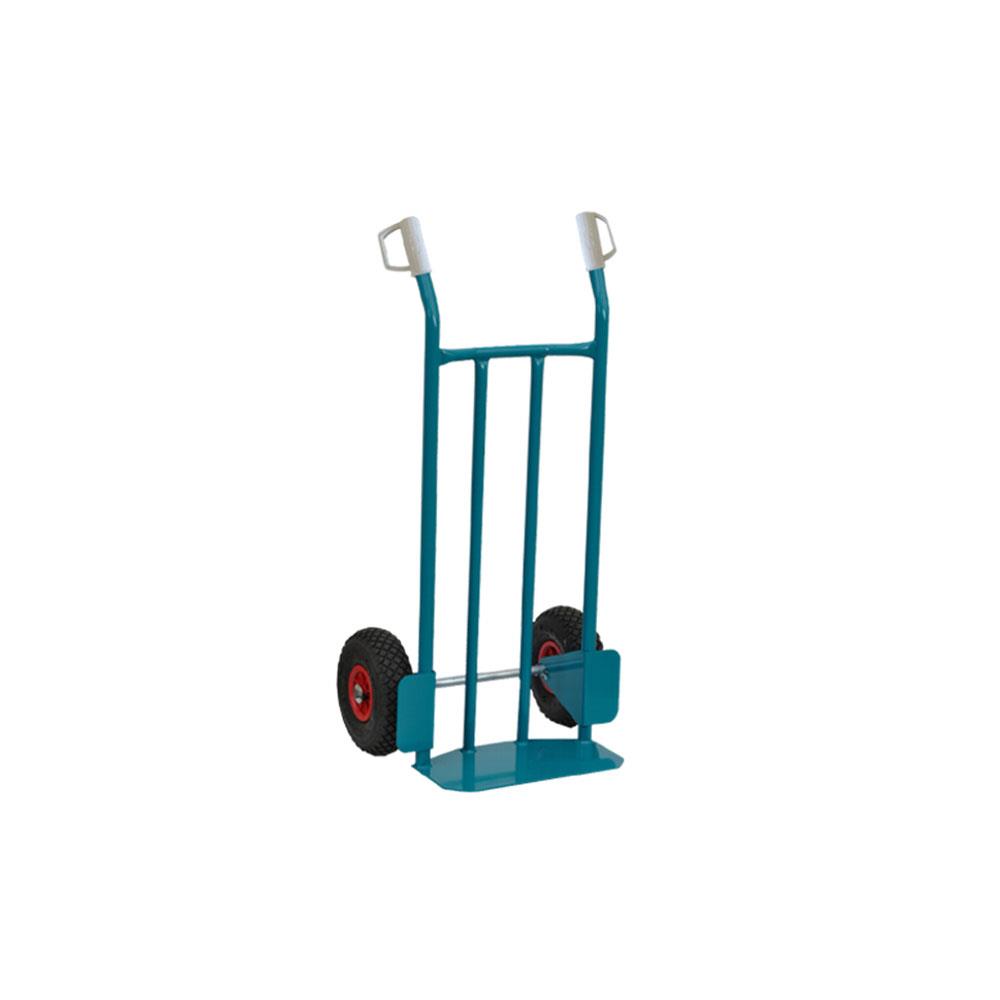 Telaio acciaio tubolare mm 30 verniciato Ruote pneumatiche - Cerchione plastica Gabbia rulli mm 260Peso kg 10,3 - Portata kg 250 Ruote e maniglie assemblate Dimensioni cm 56x17 h 110