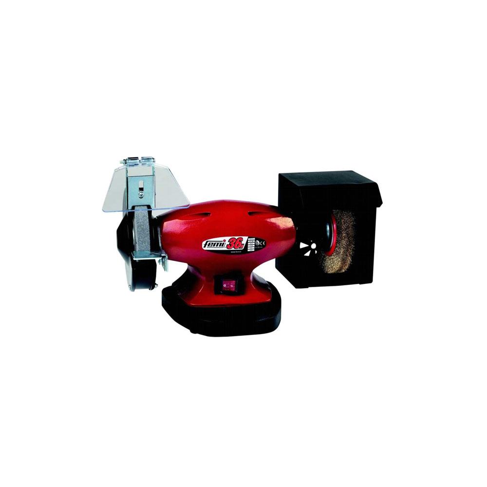 Potenza watt 450 - Mola e spazzola mm 150 Velocita' giri/min.2800 Base maggiorata con vaschetta acqua asportabile Schermi protettivi plexiglas Completa di mola abrasiva e spazzola acciaio