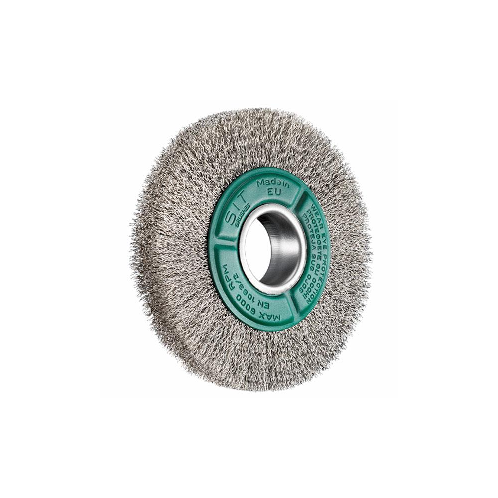 Spazzola a disco con foro mm 16/20/25 Fili acciaio inox ondulati mm 0,35 Diametro mm 150 Spessore 20 - Lunghezza fili 36 Adatta per sbavatura, satinatura e lucidatura