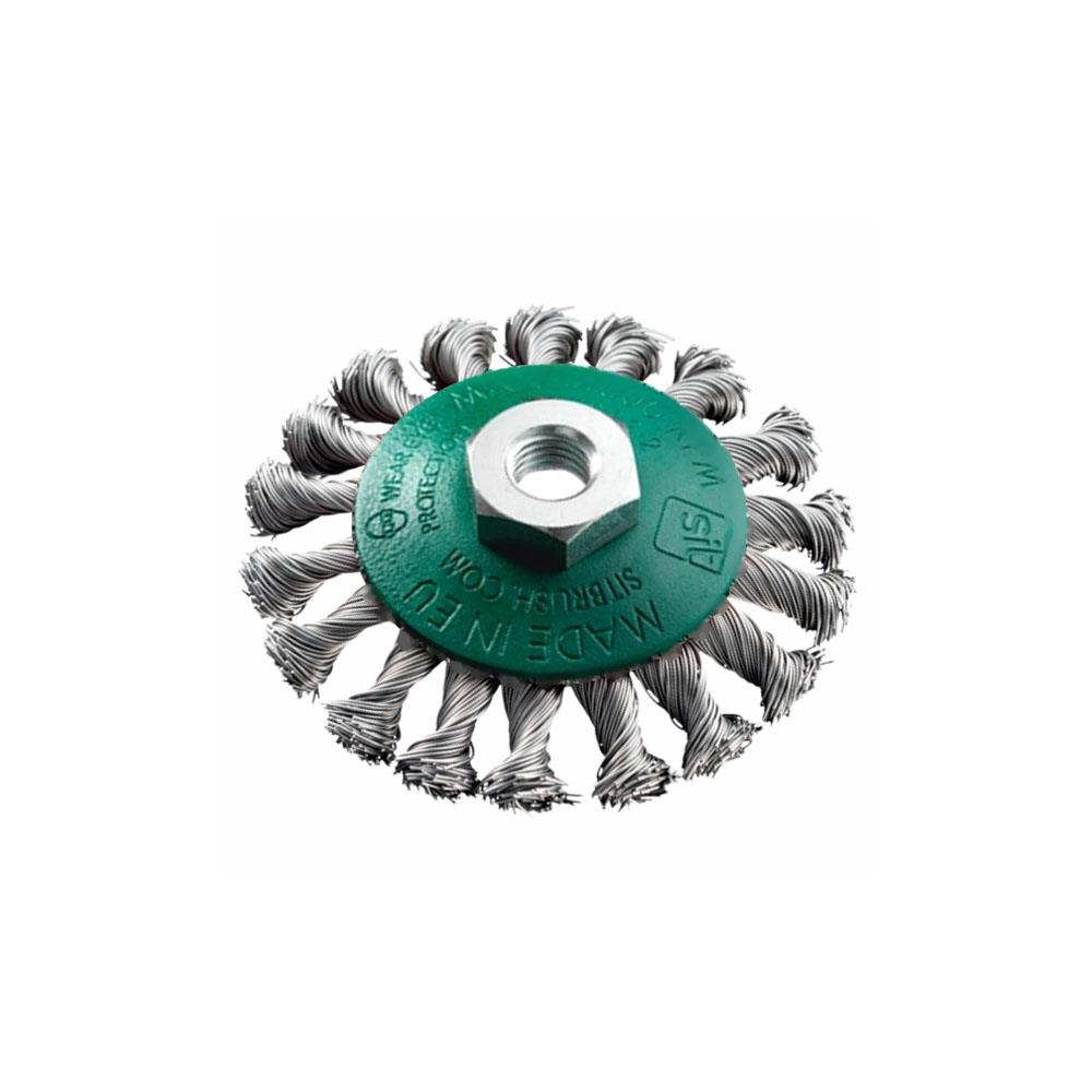 Spazzola conica con foro filettato MA14 F Fili acciaio inox ritorti mm 0,50 mazzetti 18 Diametro mm95 Altezza fili mm 20 Adatta per lavori su superfici irregolari