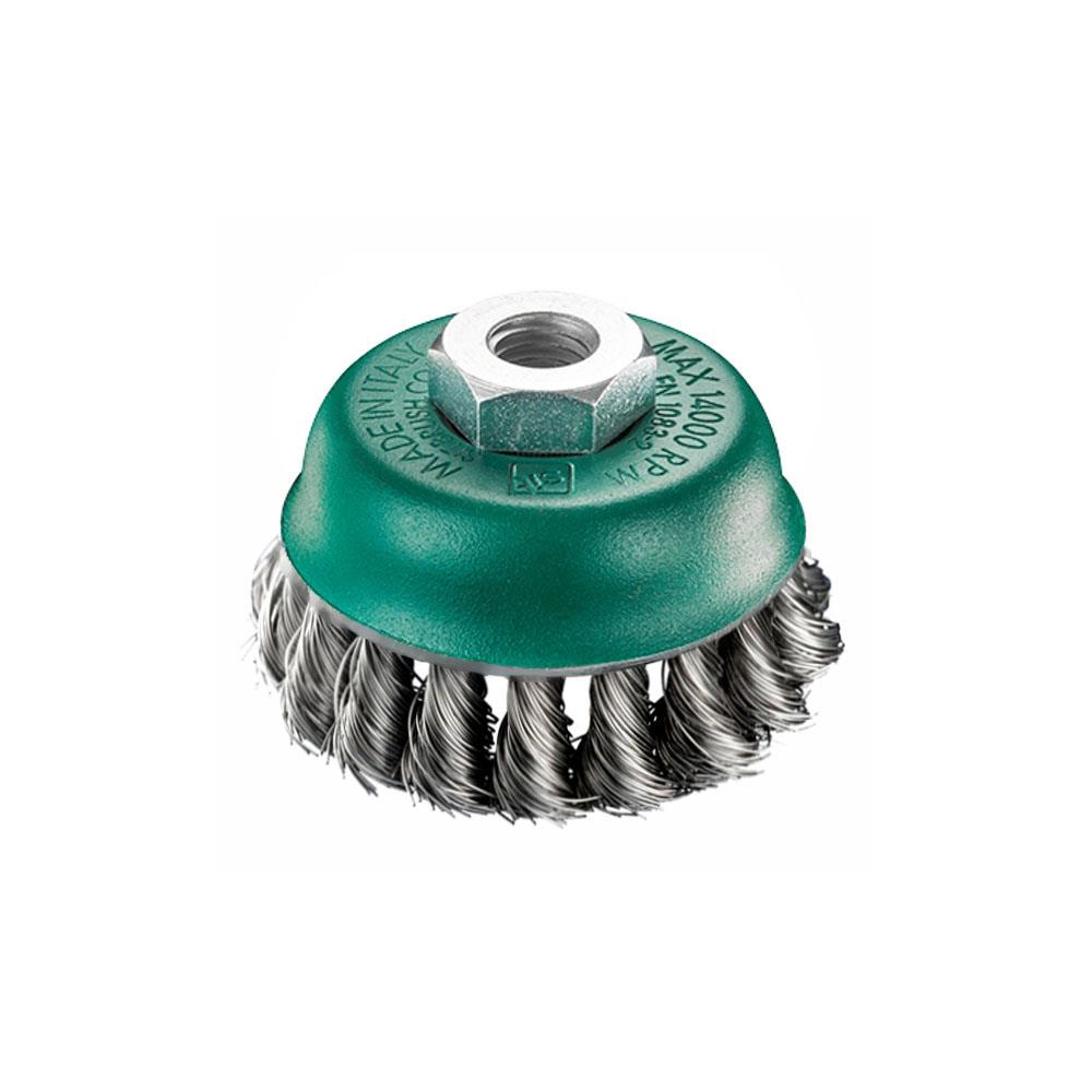 Spazzola a tazza con foro filettato MA14 F Fili inox ritorti mm 0,35 mazzetti 18 Diametro mm 70 Altezza fili mm 17 Adatta per eliminazione scorie, ruggine, vernici