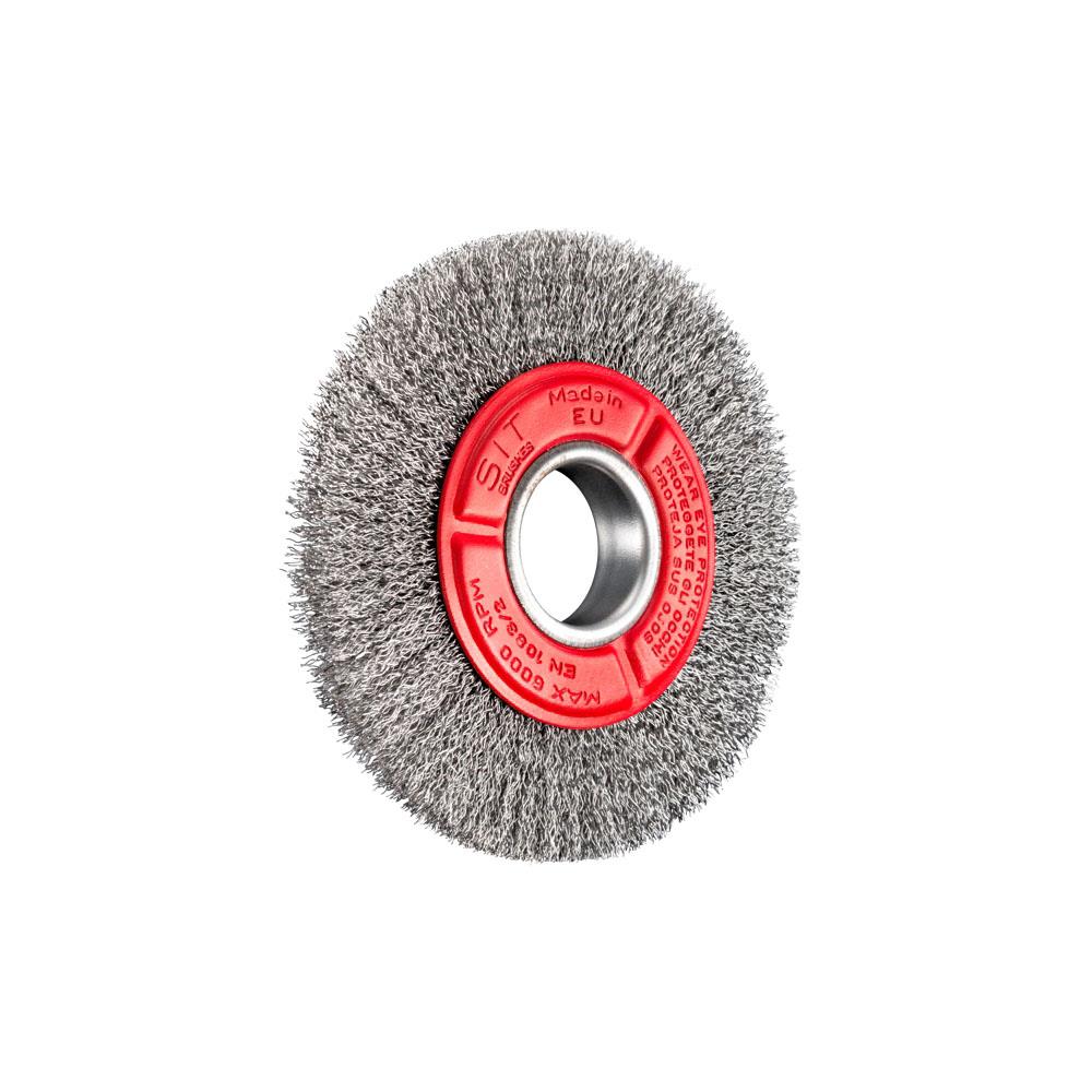 Spazzola a disco con foro mm 16/20/25 Fili acciaio ondulati mm 0,30/0,35 Diametro mm 100/125/150/200 Spessore 15/17/20/23 - Lunghezza fili 19/32/36/44 Adatta per sbavatura, satinatura e lucidatura