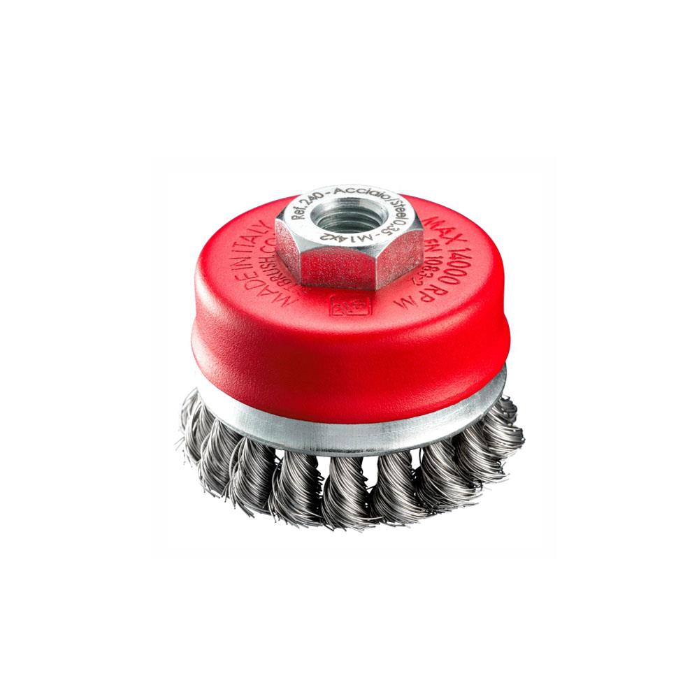 Spazzola a tazza con foro filettato MA14 F Fili acciaio ritorti mm 0,35/0,50 mazzetti 18/24 Diametro mm 70/95 Altezza fili mm 17/90 Adatta per eliminazione scorie, ruggine, vernici