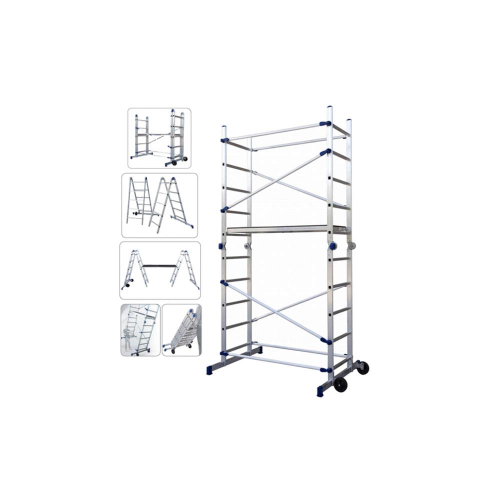 Struttura alluminio smontabile e pieghevole Sezione tubolare 60x24 - Trasformabile in scale Dimensioni cm 156x58 h 159/310 - Con ruote Portata max kg150 - Peso complessivo kg 34,50 Dotazione 1 ripiano alluminio/legno melaminico