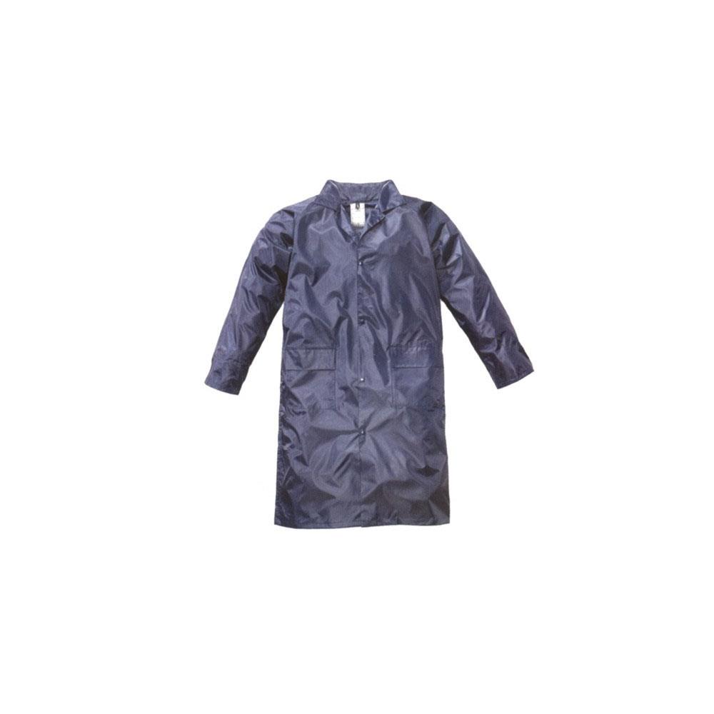 Tessuto nylon impermeabile interno spalmato PVC Cappuccio fisso con cordino a scomparsa Aerazione su dorso e sotto ascelle Chiusura con bottoni automatici - Colore blu Maniche con soffietto controvento - 2 tasche