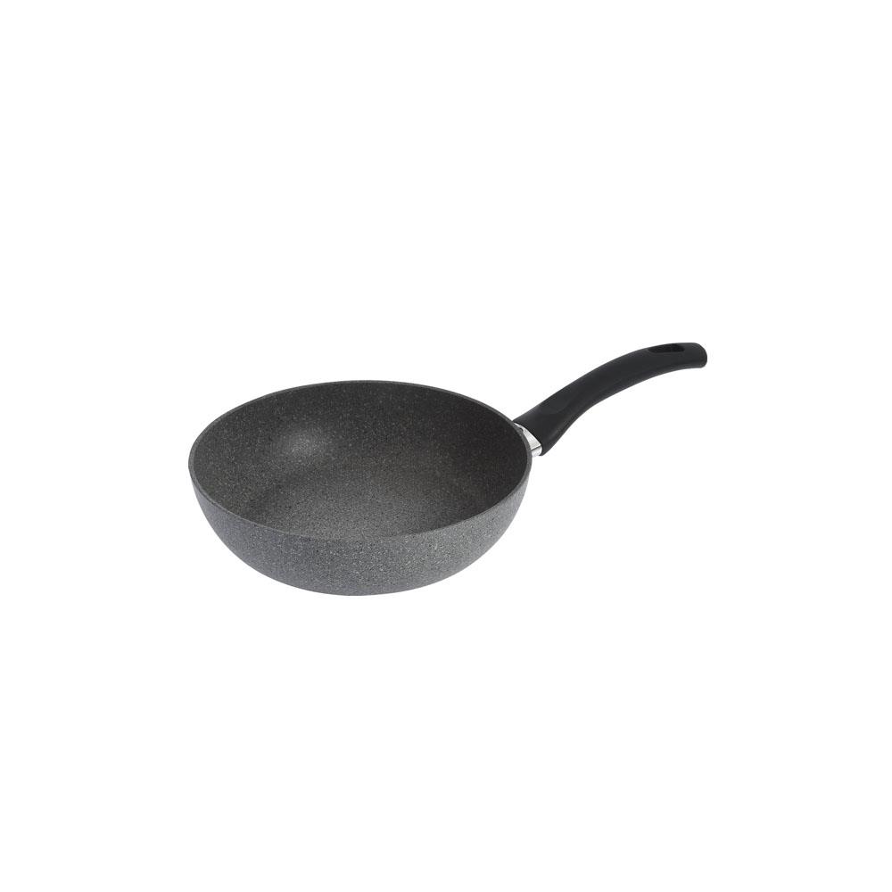Alluminio - Spessore mm 3,5 Esterno effetto pietra Interno antiaderente Granitium Manico bachelite - Ghiera Thermopoint Adatta per induzione e tutte le fonti di calore Garanzia 5 anni