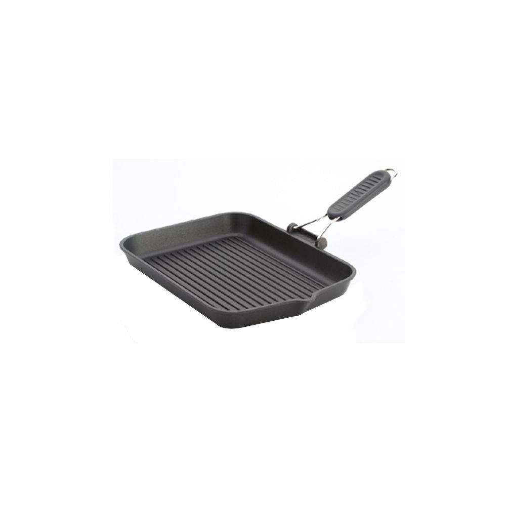 Alluminio pressofuso - Spessore mm 7 Esterno colore nero Interno antiaderente Titanium Manico silicone soft touch pieghevole Adatta per induzione e tutte le fonti di calore Garanzia 3 anni