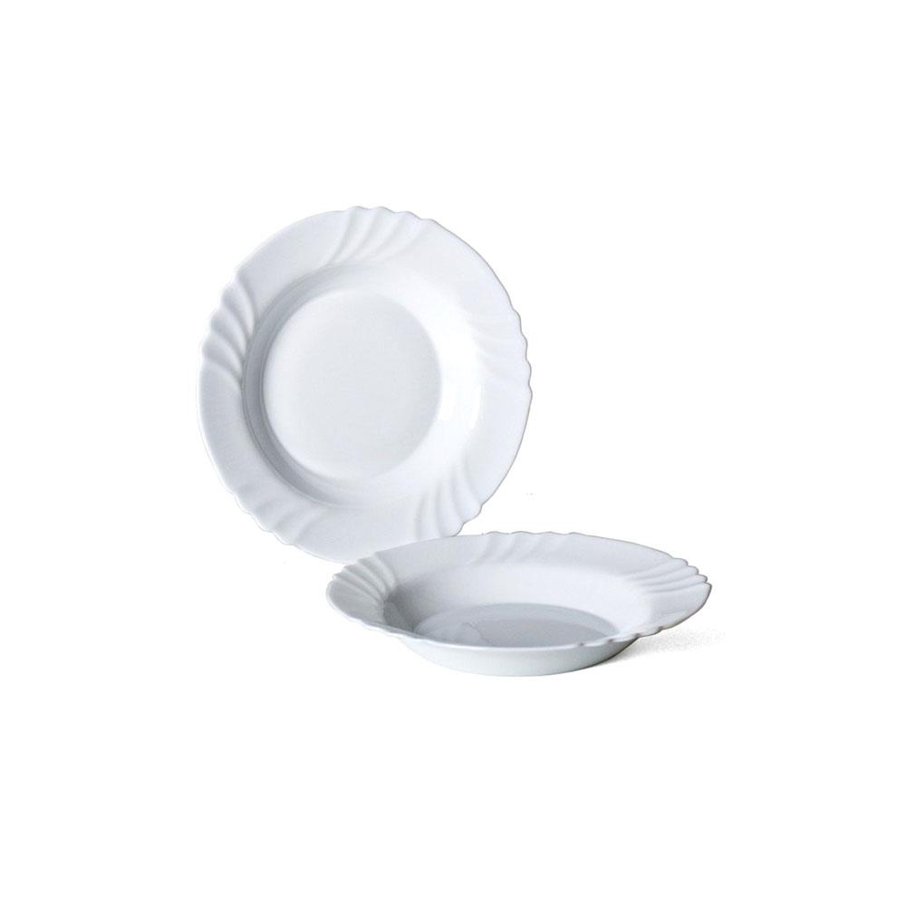 Vetro opale temprato Forma tonda Falda ad ala condecoro in rilievo 6 piani cm 25,5 - 6 fondi cm 23,5 6 frutta cm 20,2 - 1 insalatiera cm 23 Lavabilein lavastoviglie Colore bianco