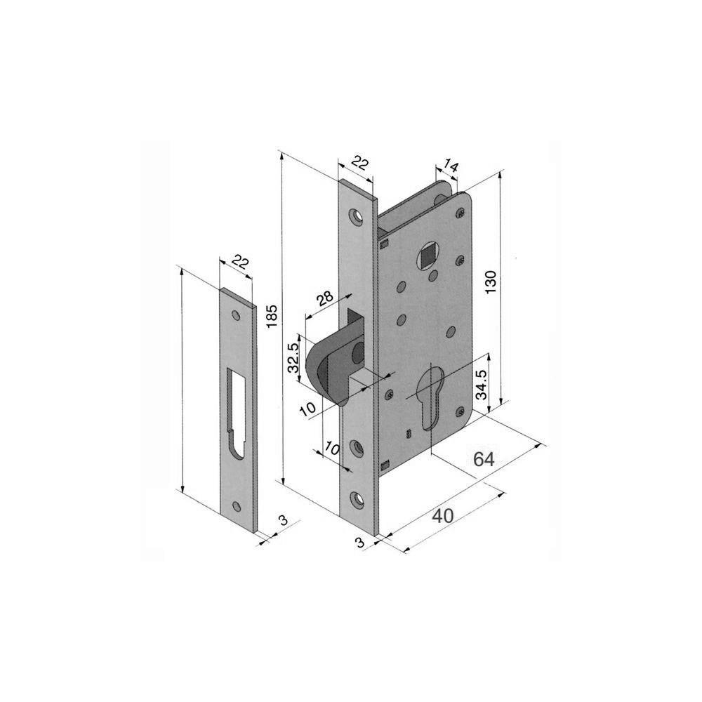 Serratura acciaio ottonato infilare legno Con gancio - Quadro mm 8 Scatola mm 130 - Frontale mm 22x185 Incontro - 2 borchie Cilindro serie 700 non incluso
