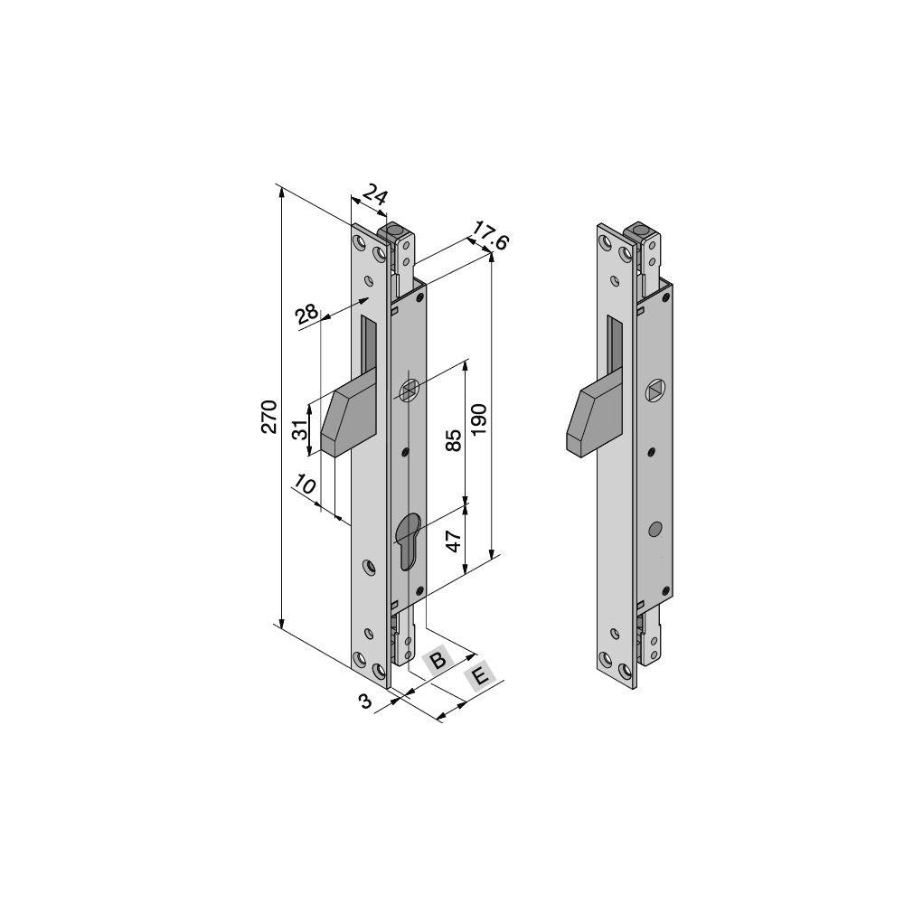 Serratura montanti alluminio infilare Acciaio nichelato - Senza incontro Catenaccio spina antitaglio Aste interne comandate da quadro maniglia Bloccaggio aste interne con cilindro Scatola mm 28x190 -Frontale mm 24x270 Cilindro 601.22.05.1 non incluso