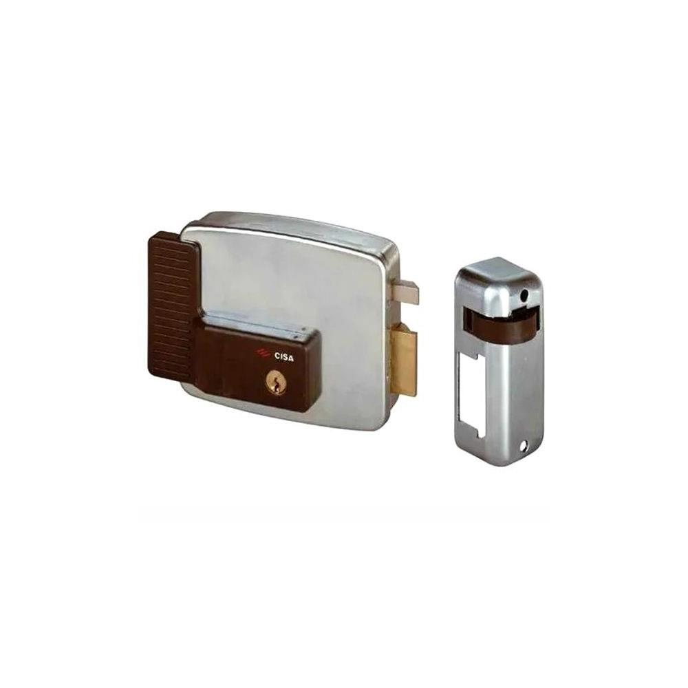 Elettroserratura V 12 porte ferro da applicare Zincata - Scrocco autobloccante Pulsante interno - 1/2 giro rovesciato Viti fissaggio - Cilindro 02139-00-0 Misure mm 128x106