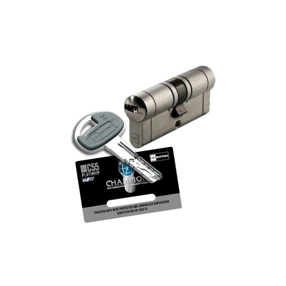 Cilindro ottone doppio nichelato frizionato Utilizzo simultaneo 2 chiavi Certificazione ICIM UNI EN1303 e SKG 5 perni di cifratura - Perno superiorematematico Resistente Bumping, Picking e Tracing Chiave elemento mobile 3 gradi liberta' e pista desmodromica comando perni coassiali Dotazione 5 chiavi punzonate, vite fissaggio e personal card Duplicazione tramite centri autorizzati Mottura