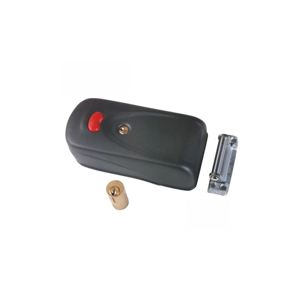 Elettroserratura V 12 porte legno da applicare Scudo protezione acciaio verniciato Bocchette metallo - Piastra e sottobocchetta Pulsante interno - Fermo a giorno Catenaccio gancio rotante - Cilindro 0G150-00-0 Reversibile - Entrata regolabile mm 50/60/70/80