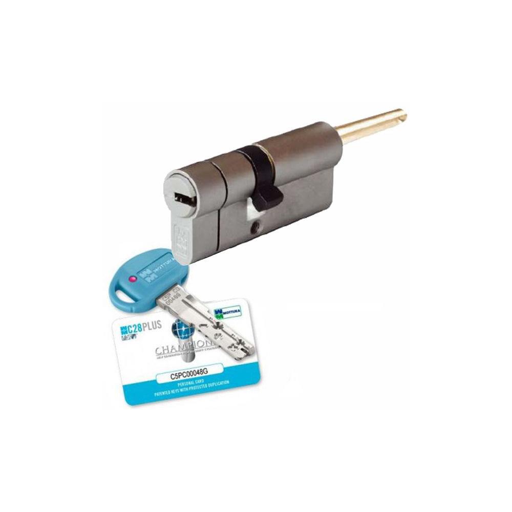 Cilindro ottone doppio nichelato Utilizzo 1 chiave e 1 pomolo Certificazione ICIM UNI EN 1303 e SKG5 perni di cifratura - Perno superiore matematicoResistente Bumping, Picking e Tracing Chiave elemento mobile 3 gradi liberta' Dotazione 3 chiavi punzonate, vite fissaggio e personal card Profilo riservato Machieraldo