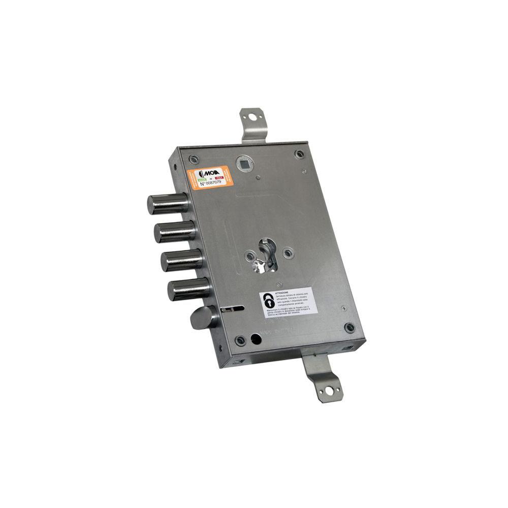 Serratura cilindro europeo Infilare porte blindate - Movimento ad ingranaggi Trappola anti effrazione - Fori protettore mm 38 2 chiusure verticali Catenacci laterali 4 pistoni e scrocco reversibile Interasse catenacci mm 28 Scrocco azionato da maniglia quadro mm 8 e chiave Scatola mm 135x206x30 - Entrata mm 63 Cilindro e aste non compresi Compatibile serrature Atra e Mottura