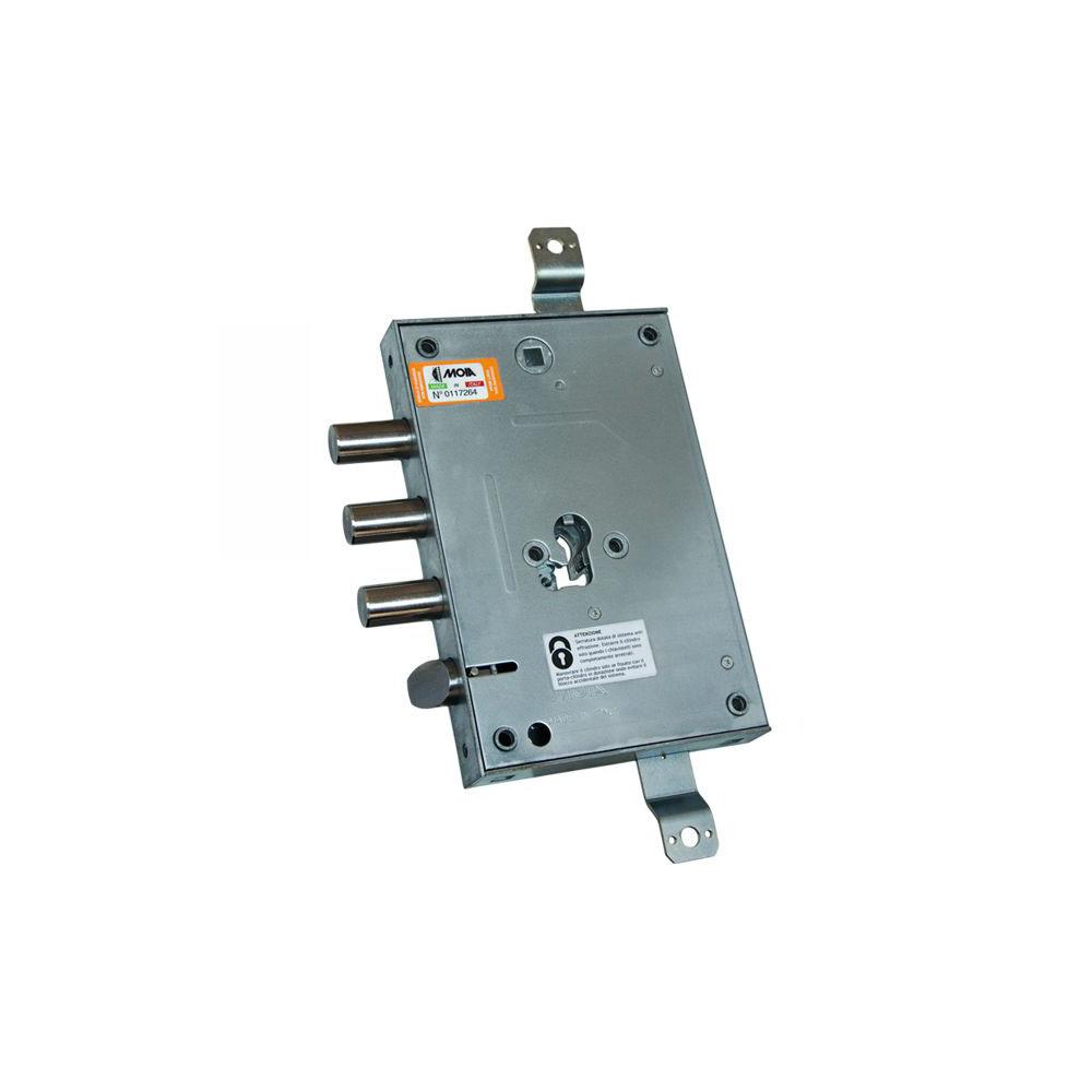 Serratura cilindro europeo Infilare porte blindate - Movimento ad ingranaggi Trappola anti effrazione - Fori protettore mm 38 2 chiusure verticali Catenacci laterali 3 pistoni e scrocco reversibile Interasse catenacci mm 37 Scrocco azionato da maniglia quadro mm 8 e chiave Scatola mm 135x206x30 - Entrata mm 63 Cilindro e aste non compresi Compatibile serrature Atra e Mottura