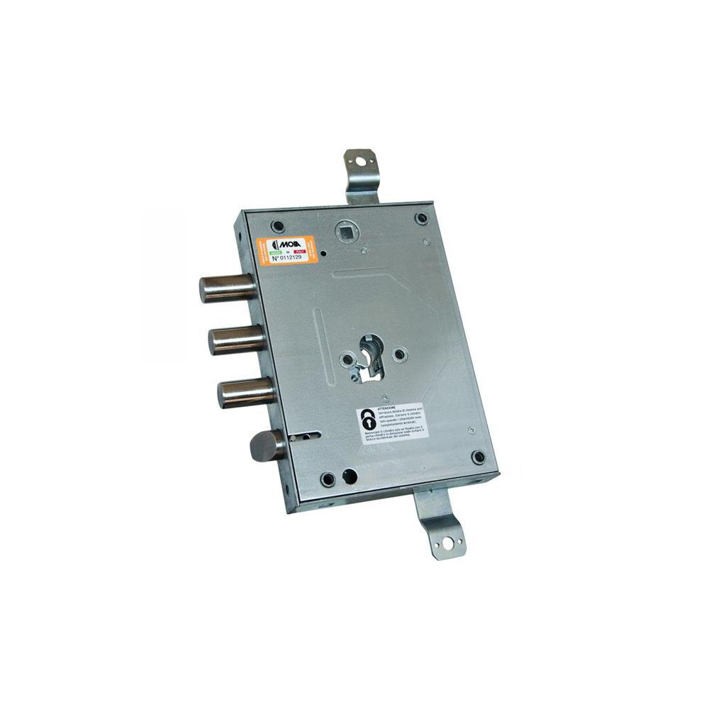 Serratura cilindro europeo Infilare porte blindate - Movimento ad ingranaggi Trappola anti effrazione - Fori protettore mm 38 2 chiusure verticali Catenacci laterali 3 pistoni e scrocco reversibile Interasse catenacci mm 37 Scrocco azionato da maniglia quadro mm 8 e chiave Scatola mm 145x206x30 - Entrata mm 73 Cilindro e aste non compresi Compatibile serrature Atra e Mottura