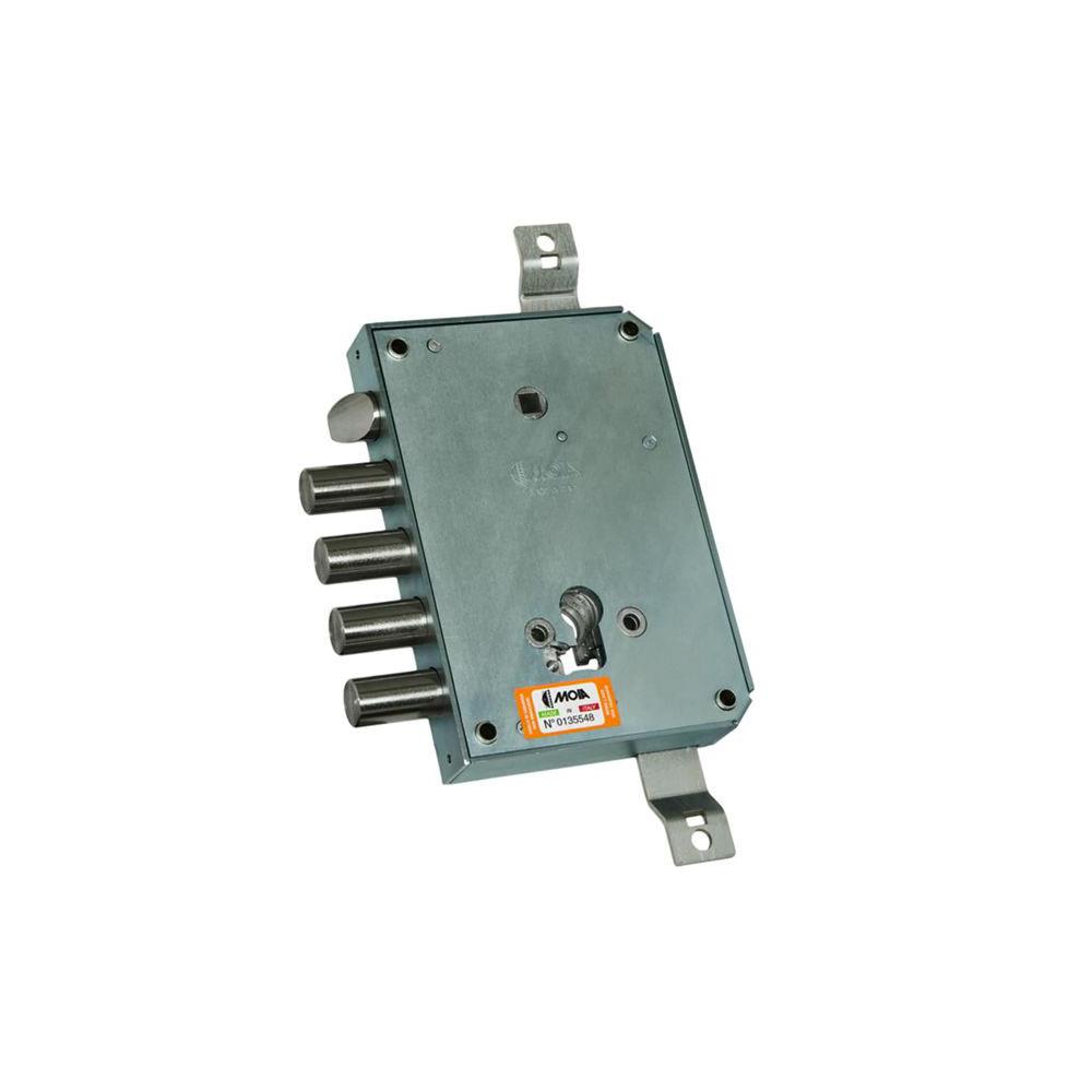 Serratura cilindro europeo Infilare porte blindate - Movimento ad ingranaggi Fori protettore mm 38 2 chiusure verticali Catenacci laterali 4 pistoni e scrocco superiore reversibile Interasse catenacci mm 28 Scatola mm 122x177x30 - Entrata mm 63 Cilindro e aste non compresi Compatibile serrature Cerutti