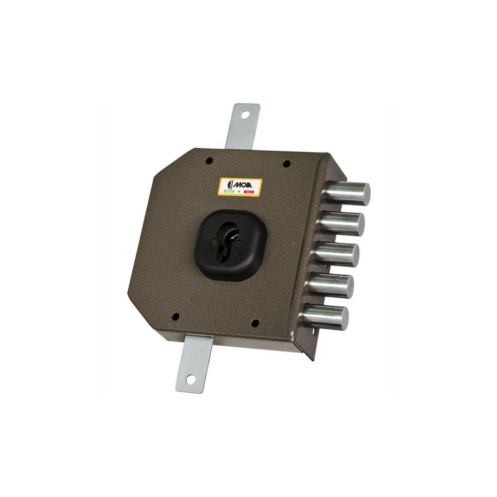 Serratura cilindro europeo applicare legno Trappola anti effrazione - Fori protettore mm 38 2 chiusure verticali Catenacci laterali 5 pistoni Interasse catenacci mm 25 Scatola mm 143,5x153,5x29 - Entrata mm 63 Aste e cilindro non compresi Compatibile serrature Mottura