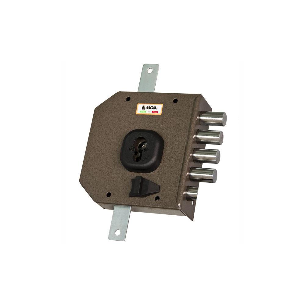 Serratura cilindro europeo applicare legno Trappola anti effrazione - Fori protettore mm 38 2 chiusure verticali Catenacci laterali 4 pistoni e scrocco reversibile Interasse catenacci mm 25 Scatola mm 143,5x153,5x29 - Entrata mm 63 Aste e cilindro non compresi Compatibile serrature Mottura