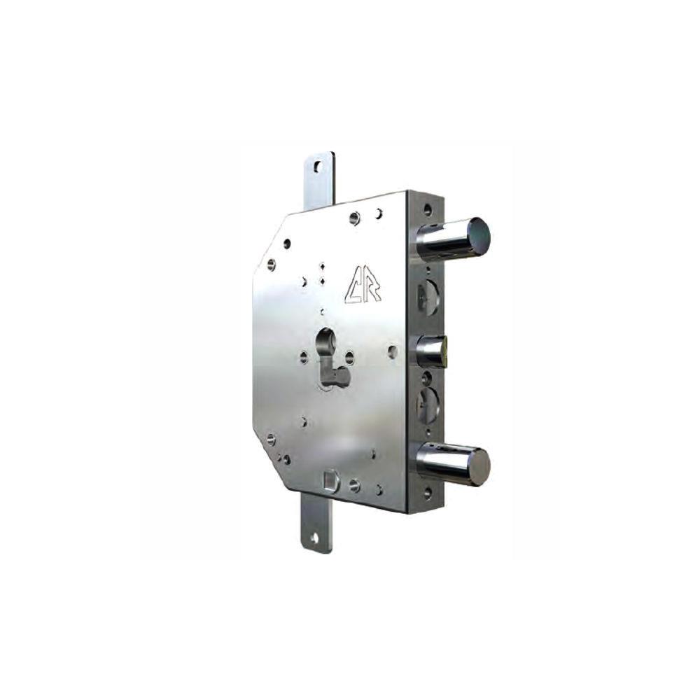 Serratura cilindro europeo infilare porte blindate Movimento ad ingranaggi Trappola anti effrazione- Fori protettore mm 38 2 chiusure verticali Catenacci laterali 2 pistoni e scrocco Interasse catenacci mm 56 Scrocco azionato da maniglia quadro mm 8 e chiave Scatola mm 130x164x29,5 - Entrata mm 60,5 Aste non incluse