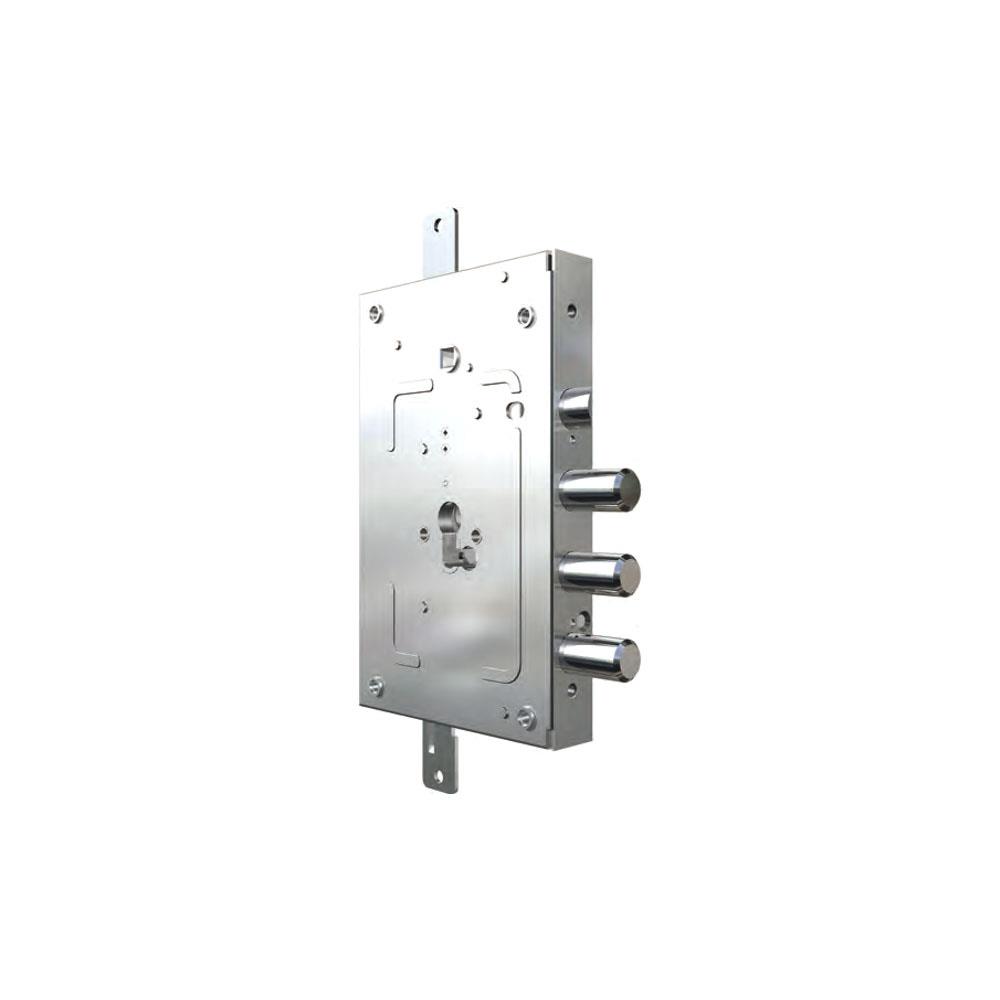 Serratura cilindro europeo infilare porte blindate Movimento ad ingranaggi Trappola anti effrazione- Fori protettore mm 38 2 chiusure verticali Catenacci laterali 3 pistoni e scrocco Interasse catenacci mm 37 Scrocco azionato da maniglia quadro mm 8 e chiave Scatola mm 142x227x29,0 - Entrata mm 68 Aste non incluse