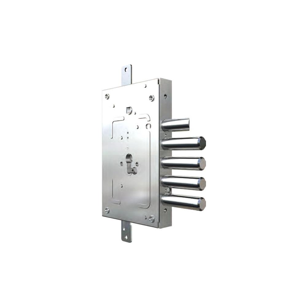 Serratura cilindro europeo infilare porte blindate Movimento ad ingranaggi Trappola anti effrazione- Fori protettore mm 38 2 chiusure verticali Catenacci laterali 4 pistoni e scrocco Interasse catenacci mm 28 - Prolungati mm 36 Scrocco azionato da maniglia quadro mm 8 e chiave Scatola mm 142x227x29,0 - Entrata mm 68 Aste non incluse Adatta porteD'ADAMI