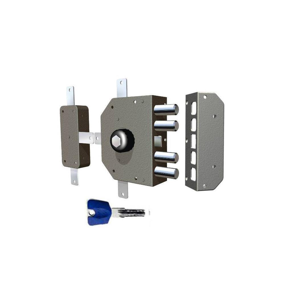 Serratura pompa chiave punzonata applicare legno 4 chiusure verticali - Pomolo interno Catenacci laterali 4 pistoni e scrocco Interasse catenacci mm 28 Scatola mm 130x164x51,5 - Entrata mm 60,5 Fornita con ferrogliera e deviatore Aste non incluse Dotazione 3 chiavi punzonate K55