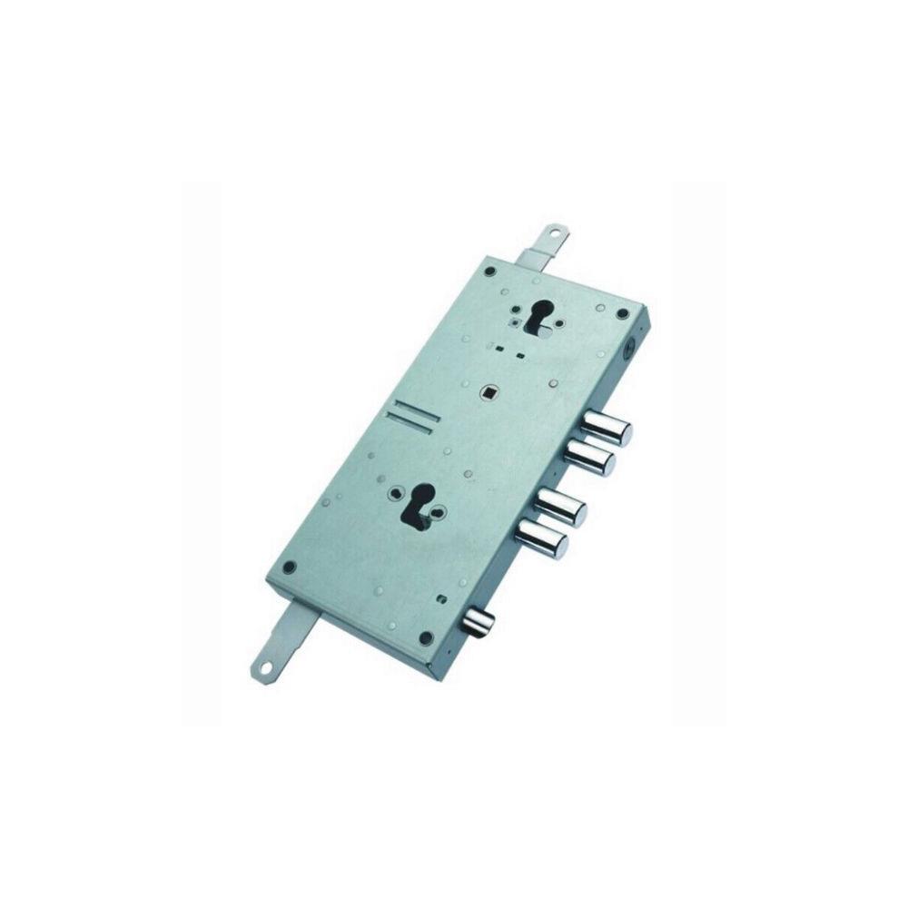 Serratura doppio cilindro europeo applicare legnoMovimento ad ingranaggi 2 chiusure verticali Catenacci laterali 4 pistoni e scrocco reversibile Interasse catenacci mm 26 Scatola mm 140x305x30 - Entrata mm 70 Cilindri e aste non compresi