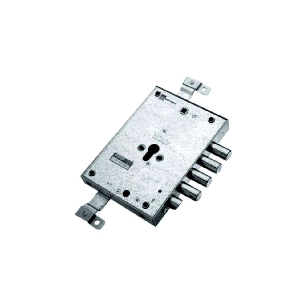 Serratura cilindro europeo applicare legno Movimento ad ingranaggi 2 chiusure verticali - Sbalzi aste mm 24 Catenacci laterali 4 pistoni e scrocco Interasse catenacci mm 28 Scatola mm 146x206x30 - Entrata mm 73 Cilindro e aste non compresi