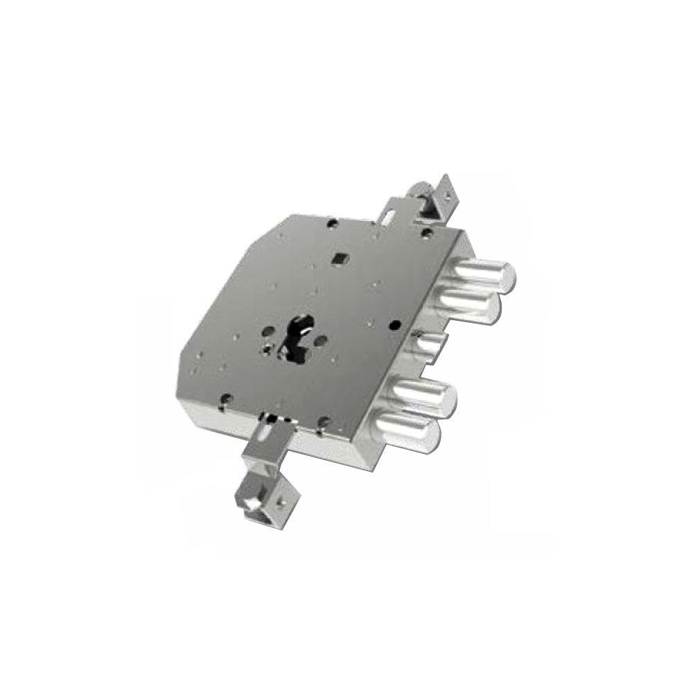 Serratura cilindro europeo applicare legno Trappola anti effrazione - Fori protettore mm 38 2 chiusure verticali Catenacci laterali 4 pistoni e scrocco centrale Interasse catenacci mm 22 Scatola mm 143x150x30 - Entrata mm 69,5 Sbalzi premontati con distanziatori Cilindro e aste non compresi