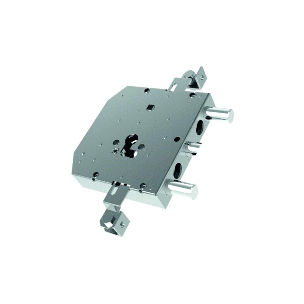Serratura cilindro europeo applicare legno Trappola anti effrazione - Fori protettore mm 38 2 chiusure verticali Catenacci laterali 2 pistoni e scrocco centrale Interasse catenacci mm 108 Scatola mm 143x150x30 - Entrata mm 69,5 Sbalzi premontati condistanziatori Cilindro e aste non compresi