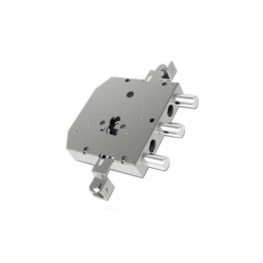 Serratura cilindro europeo applicare legno Trappola anti effrazione - Fori protettore mm 38 2 chiusure verticali Catenacci laterali 3 pistoni Interasse catenacci mm 54 Scatola mm 143x150x30 - Entrata mm 69,5 Sbalzi premontati con distanziatori Cilindro e aste non compresi