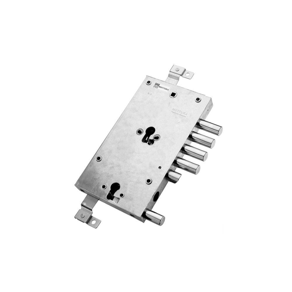 Serratura doppio cilindro europeo applicare legnoMovimento ad ingranaggi 2 chiusure verticali Catenacci laterali 5 pistoni e scrocco Interasse catenacci mm 28 Scatola mm 258x146x31 - Entrata mm 73 Cilindri e aste non compresi