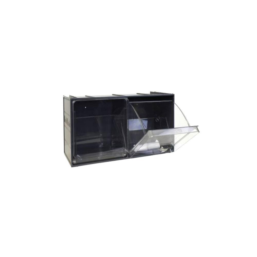Sistema modulare assemblabile ad incastro Composizione 2 cassetti PET basculanti Cassetti adatti uso alimentare Resistenti da -50^/+150^ Misure modulo mm 600x240 h 300 Misure cassetti mm 258x190 h 165 Colore grigio scuro