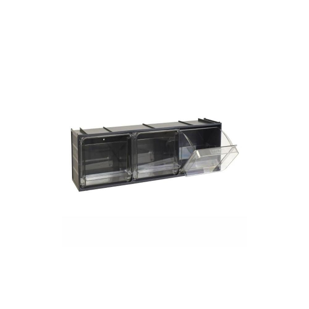 Sistema modulare assemblabile ad incastro Composizione 3 cassetti PET basculanti Cassetti adatti uso alimentare Resistenti da -50^/+150^ Misure modulo mm 600x155 h 175 Misure cassetti mm 160x107 h 105 Colore grigio scuro