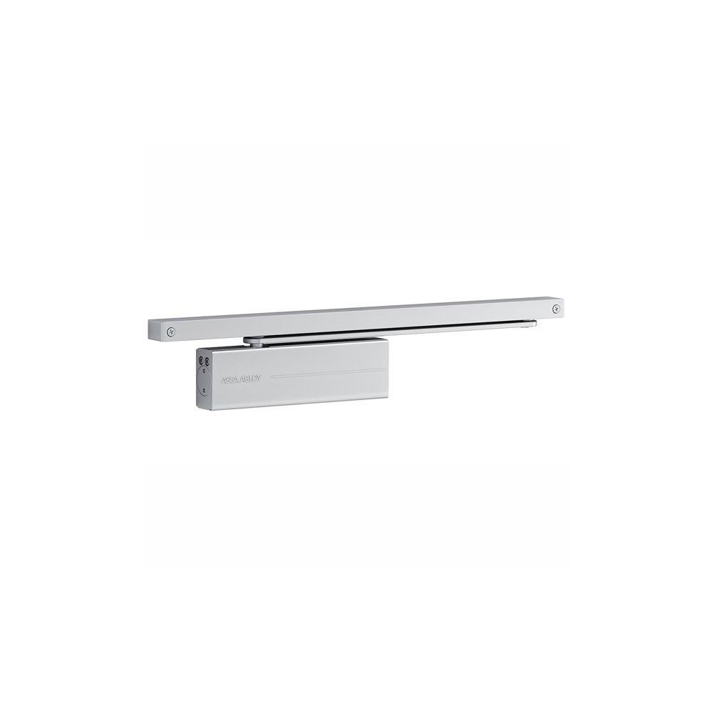 Corpo alluminio - Custodia alluminio Braccetto fisso con guida a slitta senza arresto Regolazione forza chiusura EN 3/4 Regolazione velocita' chiusura e forza colpoPorte destre e sinistre a battente Porte cm 95/110 Lunghezza mm 200 - Profondita' mm 32