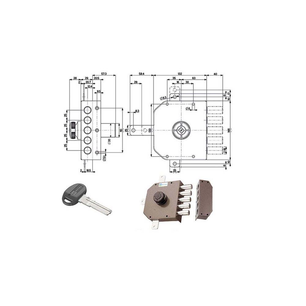 Serratura pompa chiave punzonata applicare legno 4 chiusure verticali - Pomolo interno Catenacci laterali 5 pistoni Misura scatola mm 132x146x30 - Entrata mm 63 Diametro cilindro mm 30 Fornita senza aste e deviatore Dotazione 3 chiavi testa plasticaC10