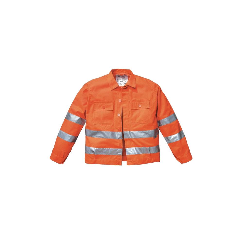 Cotone poliestere - Colletto a camicia Maniche con polsini chiusura bottoni e velcro Cintura in vita - Chiusura frontale bottoni Bande retroriflettenti 3M orizzontali Colore arancio - DPI II categoria