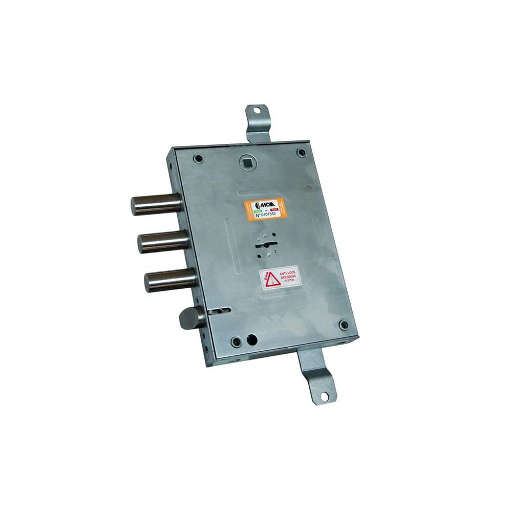 Serratura doppia mappa a planare Movimento ad ingranaggi 2 chiusure verticali Catenacci laterali 3 pistoni e scrocco reversibile Interasse catenacci mm 37 Scrocco azionato da maniglia quadro mm 8 e chiave Scatola mm 135x206x30 - Entrata mm 63 3 chiavi