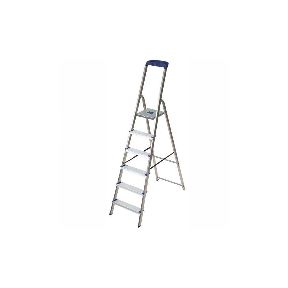 Montanti alluminio sezione mm 42x20 e mm 35x20 Gradini alluminio mm 82 rivettati piano zigrinato Tiranti poliestere - Vaschetta portaoggetti Piattaforma acciaio Piedini antiscivolo - Norme EN 131