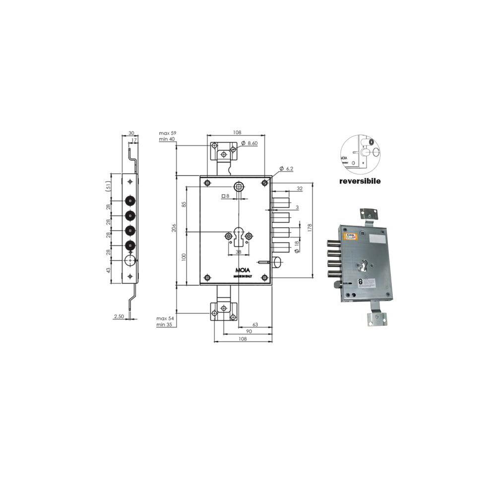 Serratura cilindro europeo a planare Movimento adingranaggi Fori protettore mm 38 2 chiusure verticali Catenacci laterali 4 pistoni e scrocco Interasse catenacci mm 28 Scatola mm 178x108x30 - Entrata mm 63 Cilindro non incluso