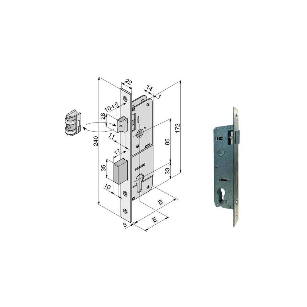 Serratura montanti alluminio infilare Frontale acciaio nichelato Senza incontro e rullo 1 mandata - Scrocco reversibile - Quadro mm 8 Scrocco o rullo regolabile intercambiabile Scatola mm 33/37/42/47x172 - Frontale mm 22x240 Entrata mm 20/25/30/35 - Cilindro 700 non incluso