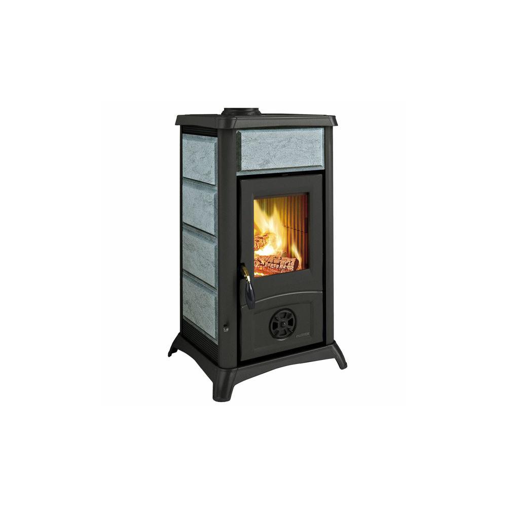 Dimensioni 46x49 h 84 - Uscita 12 - Peso Kg 98 Potenza kW 6,0 - mc 172 Focolare ghisa - Rivestimento pietra naturale Regolazione aria primaria e secondaria Vetro ceramico resistente fino a 750^