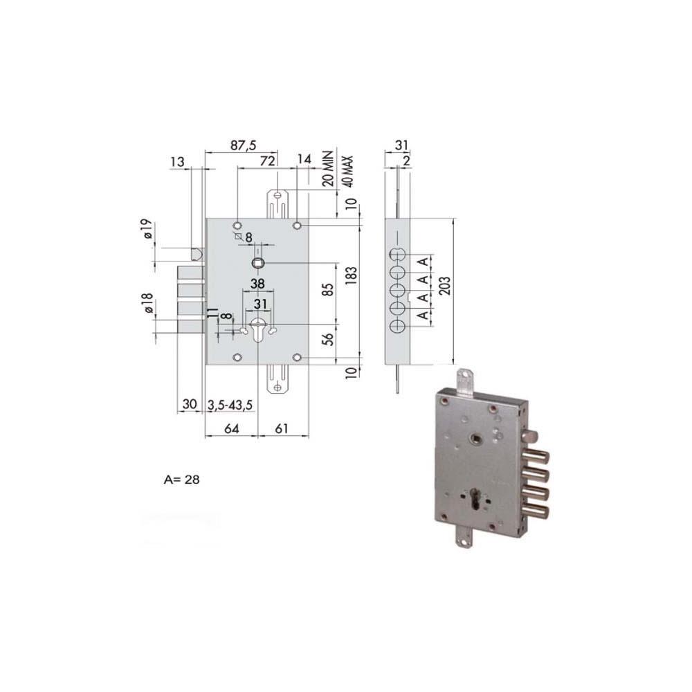Serratura cilindro europeo a planare Catenacci laterali 4 pistoni e scrocco reversibile Interasse catenacci mm 28/38 Sporgenza da chiusa mm 2,5 2 chiusure verticali Scatola 125x203 - Entrata mm 64 Cilindro non incluso