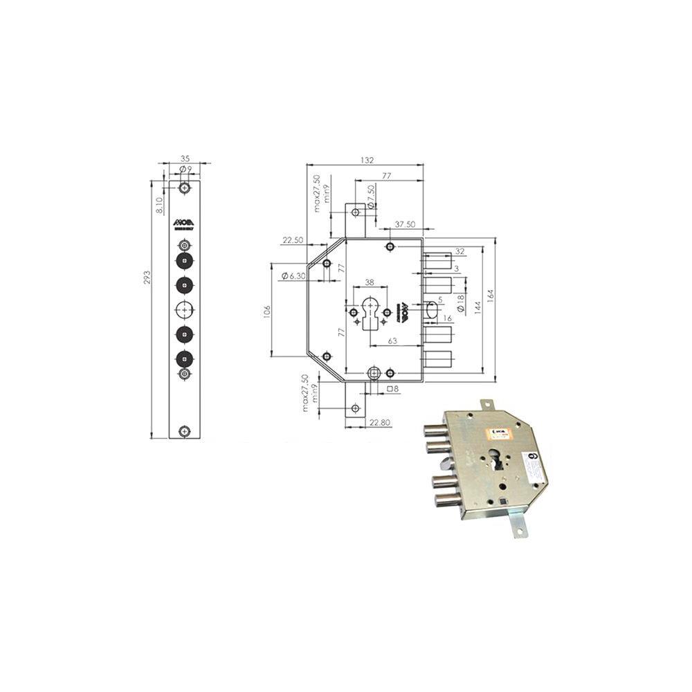 Serratura cilindro europeo a planare Trappola anti effrazione - Fori protettore mm 38 2 chiusure verticali Catenacci laterali 4 pistoni e scrocco Interasse catenacci mm 28 Scrocco azionato da maniglia quadro mm 8 e chiave Scatola mm 164x132x29 - Entrata mm 60 Cilindro non incluso