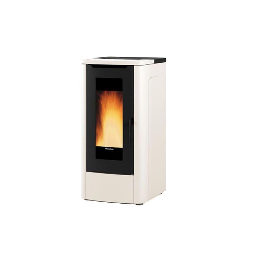 Dimensioni 52x65 h 108 - Peso kg 165 - mc 287 Potenza kW 3,0/12,0 - Consumo pellets kg/h 0,7/2,3 Ventilazione forzata - Alimentazione automatica Capacita' serbatoio kg 30 - Struttura acciaio Scambiatore di calore a fascio tubiero Uscita fumi posteriore o superiore mm 80 Braciere e porta in ghisa Rivestimento acciaio smaltato
