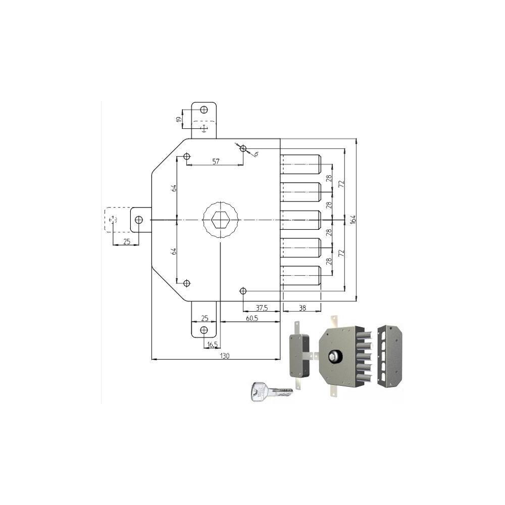 Serratura pompa applicare legno 4 chiusure verticali - Pomolo interno Catenacci laterali 5 pistoni Interasse catenacci mm 28 Scatola mm 130x164x51,5 - Entrata mm 60,5 Cilindro lunghezza mm 50 - Diametro mm 29 Deviatore incluso Aste non incluse 3 chiavi punzonate T200 cod.00940 Profilo riservato Machieraldo