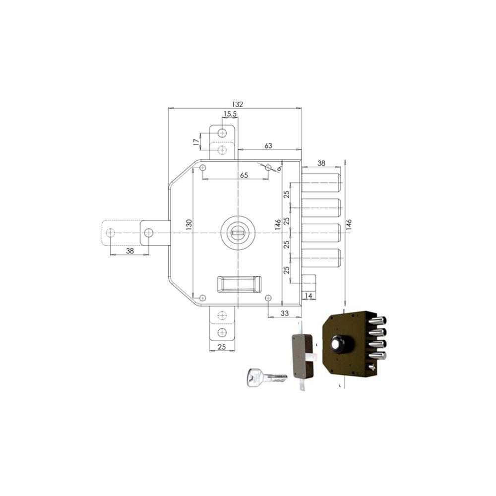 Serratura pompa applicare legno 4 chiusure verticali - Pomolo interno Catenacci laterali 4 pistoni e scrocco Interasse catenacci mm 25 Scatola mm 132x146x49,5 - Entrata mm 63,0 Cilindro lunghezza mm 50 - Diametro mm 29 Deviatore incluso Aste non incluse 3 chiavi punzonate T200 cod.00940 Profilo riservato Machieraldo