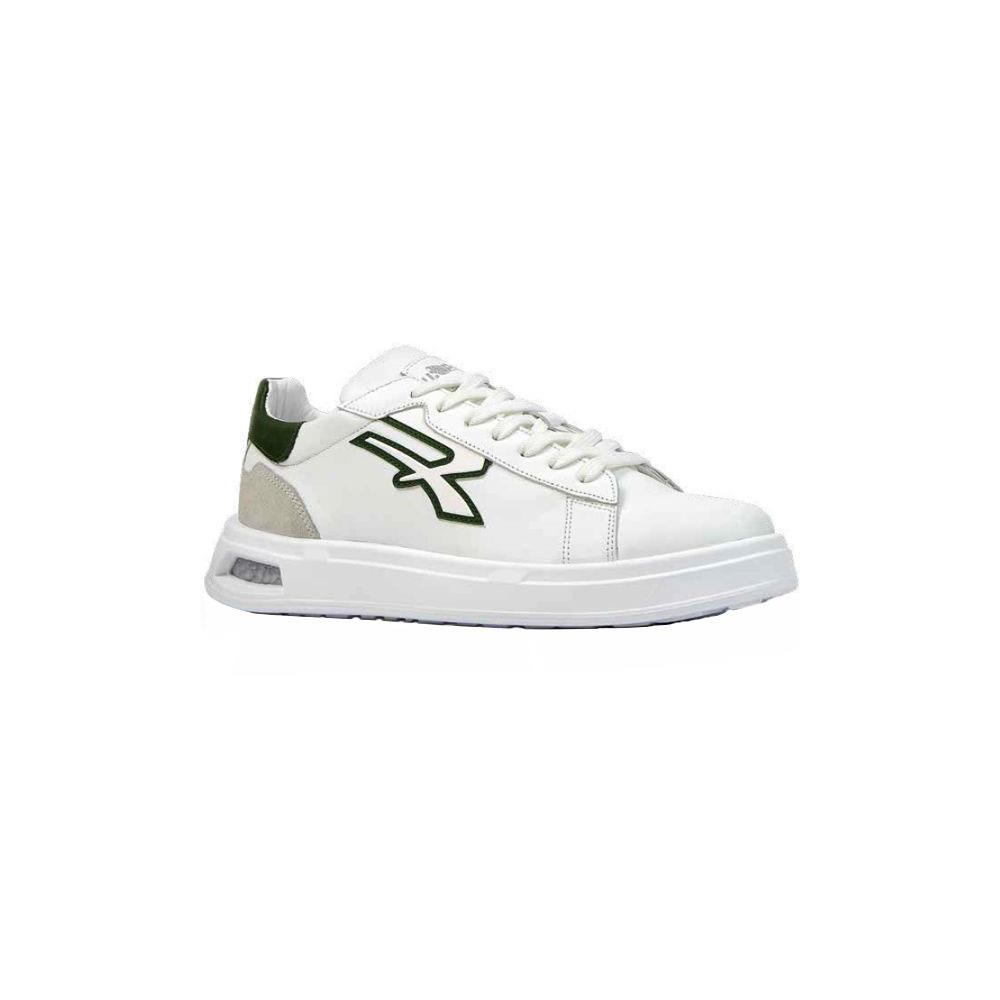 Tomaia pelle e suede Fodera interna pelle e spugna di cotone Linguetta pelle Suola PU compatto Puntale traforato Coprisottopiede pelle Inserto defaticante Infinergy BASF Protezione classe OB SR - EN 20347:2022 Colore bianco inserti verde e beige
